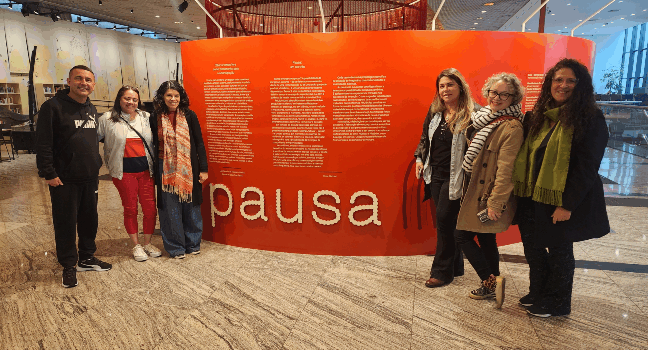 Na última quarta-feira (30/07), os educadores estiveram no Sesc 14 Bis, no coração da Bela Vista, para uma experiência transformadora. O ponto alto da visita foi a exposição “Pausa”, da renomada artista Stela Barbieri. A mostra convidou os presentes a uma profunda reflexão, questionando o significado e a importância das pausas no dia a dia das crianças. Perguntas como “O que é uma pausa?” e “Que tipos de experiências são possíveis em uma pausa?” guiaram o diálogo e o olhar sensível para o tempo dos pequenos.