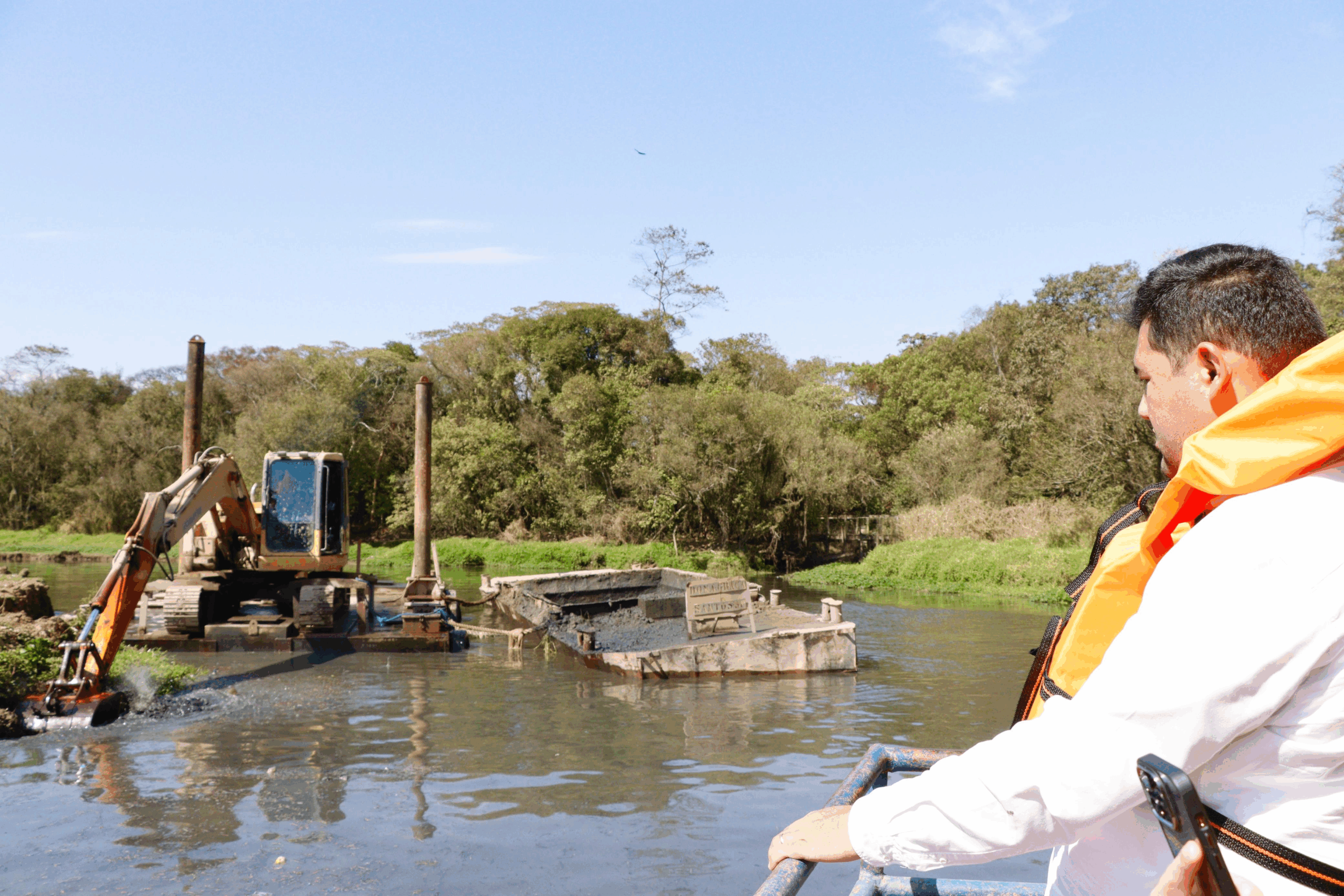 Nesta quarta-feira, 20 de agosto, o prefeito Pedro Ishi, acompanhado do secretário municipal de Manutenção e Serviços Urbanos, Samuel Oliveira, visitou a barcaça que opera na estrada do Furuyama para acompanhar de perto o andamento dos serviços, que tiveram um avanço expressivo de 38% em janeiro para o patamar atual.