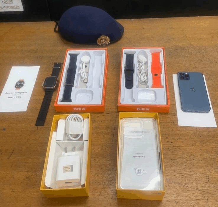 - Bens Recuperados: Com ele e pelo caminho da fuga, os guardas encontraram um iPhone 12 Pro, pulseiras de smart watch e acessórios. Durante uma revista minuciosa na delegacia, um smart watch foi encontrado escondido na roupa íntima do suspeito.