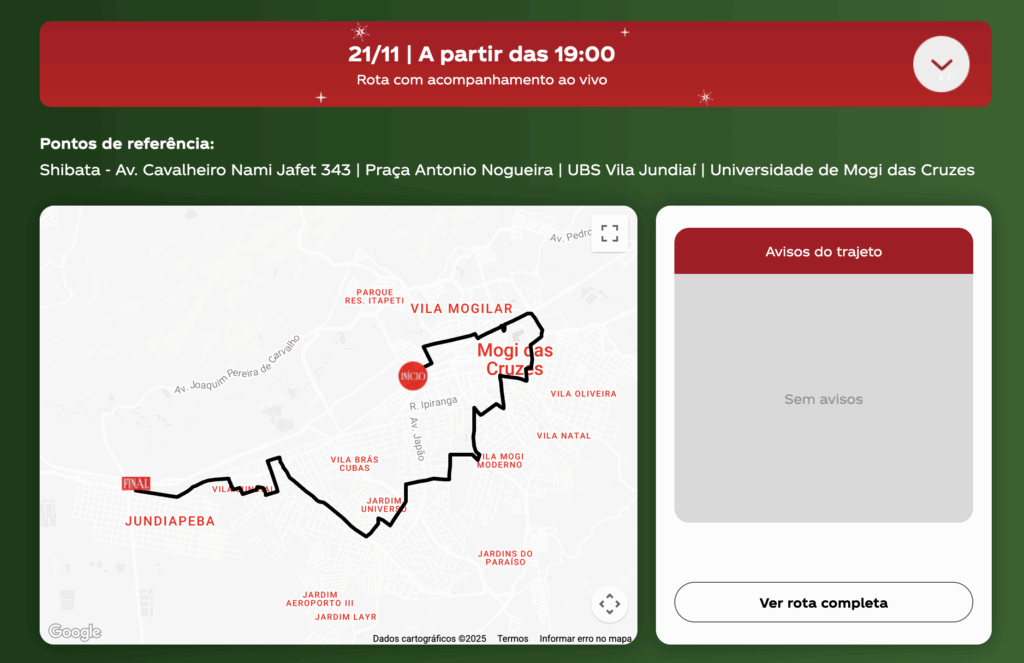 Em Mogi das Cruzes, a comitiva natalina tem previsão de início por volta das 19h. O trajeto passará por bairros importantes como Centro, Vila Partênio, Parque Santana, Jardim Universo, e seguirá até os distritos de Braz Cubas e Jundiapeba.