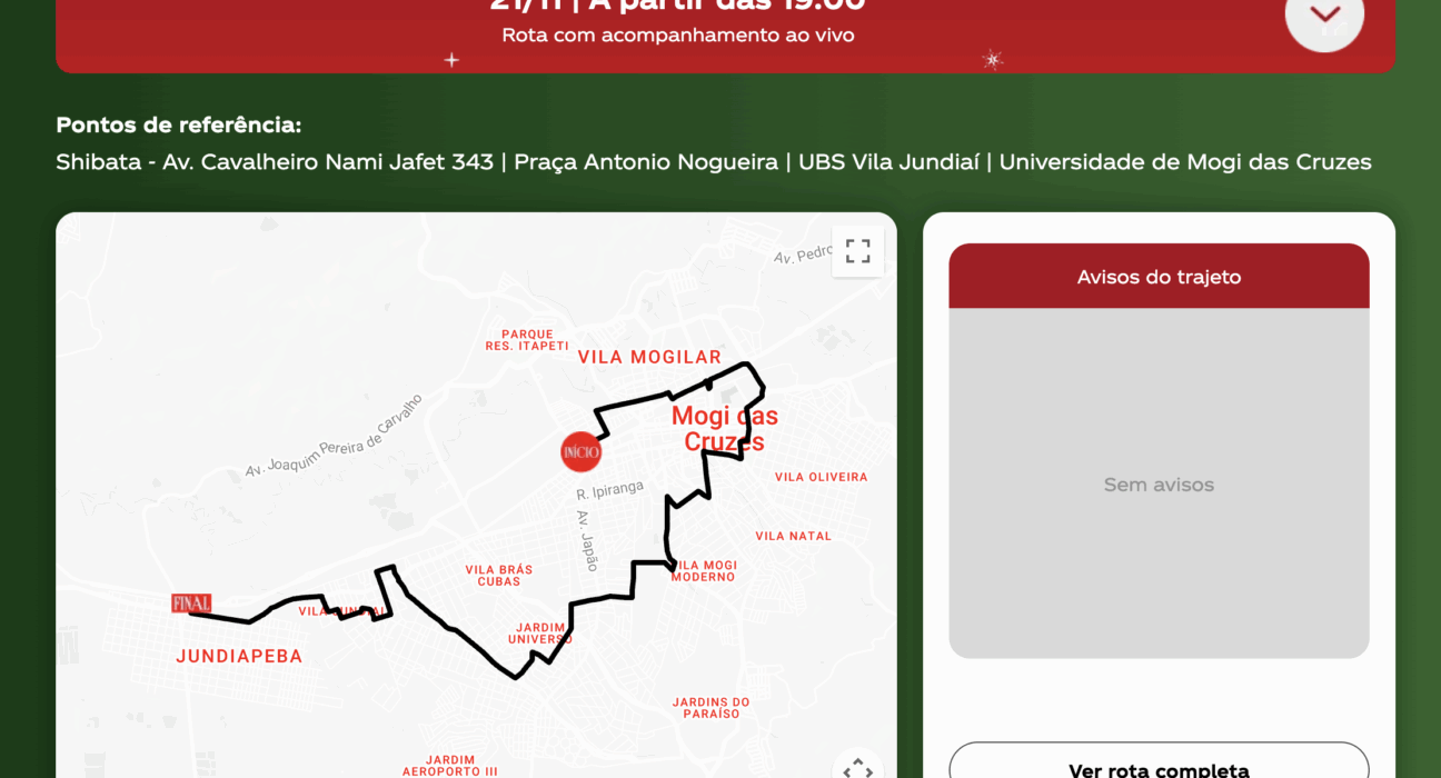 Em Mogi das Cruzes, a comitiva natalina tem previsão de início por volta das 19h. O trajeto passará por bairros importantes como Centro, Vila Partênio, Parque Santana, Jardim Universo, e seguirá até os distritos de Braz Cubas e Jundiapeba.