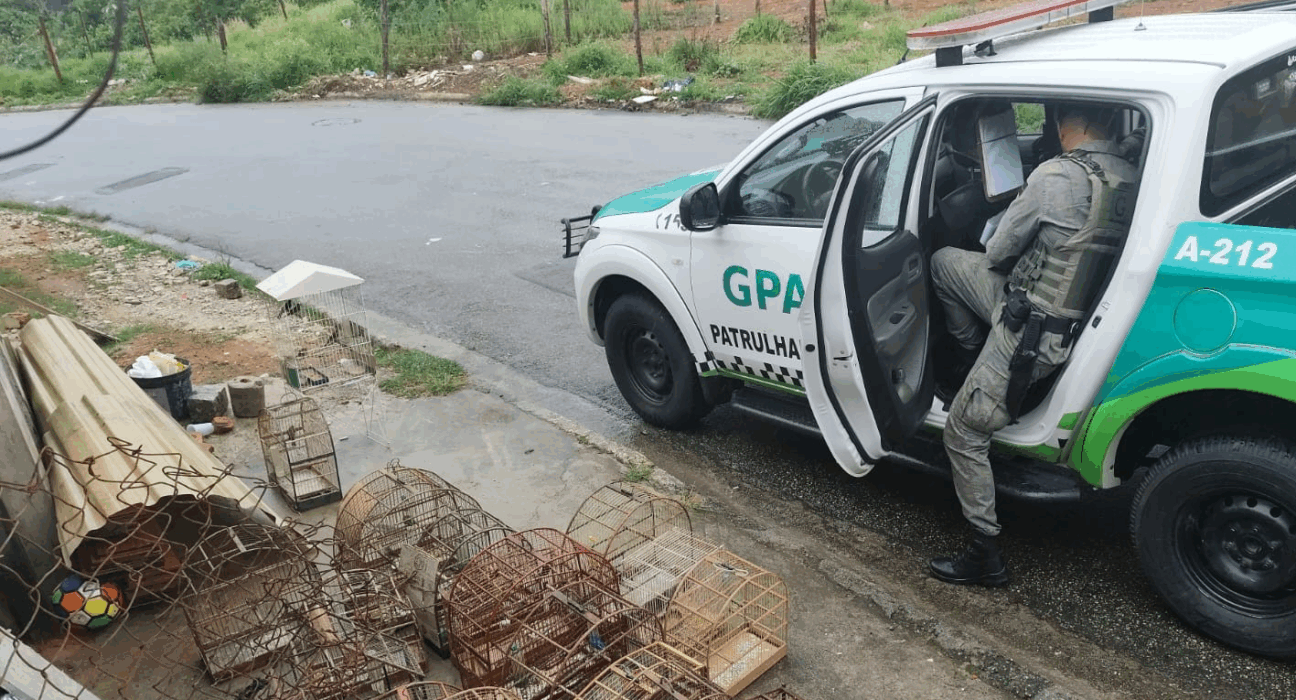 A primeira ação ocorreu às 13h10 na Rua Joel Gomes Barbosa, no bairro Raffo. Durante patrulhamento, a equipe do GPA avistou diversas gaiolas com aves na garagem de uma residência.