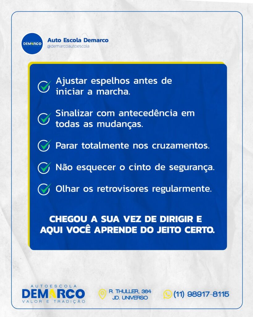 Você já sentiu aquele frio na barriga só de pensar na prova prática de direção? Para a Autoescola DeMarco, a chave para vencer o nervosismo é uma só: preparo. Localizada no Jardim Universo, em Mogi das Cruzes, a escola defende que, quando a técnica correta se torna um hábito, a aprovação se torna apenas uma consequência natural.