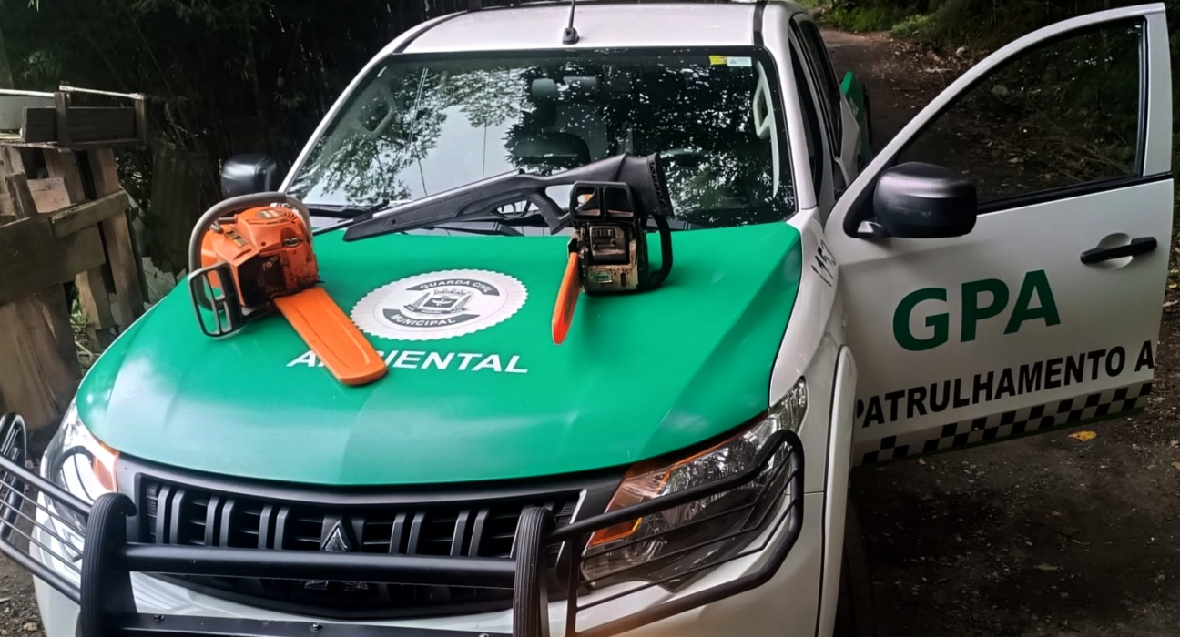 GCM de Suzano flagra desmatamento e queima ilegal na Vila Barros. Operação apreendeu motosserras e arma de pressão em Área de Preservação Permanente (APP).