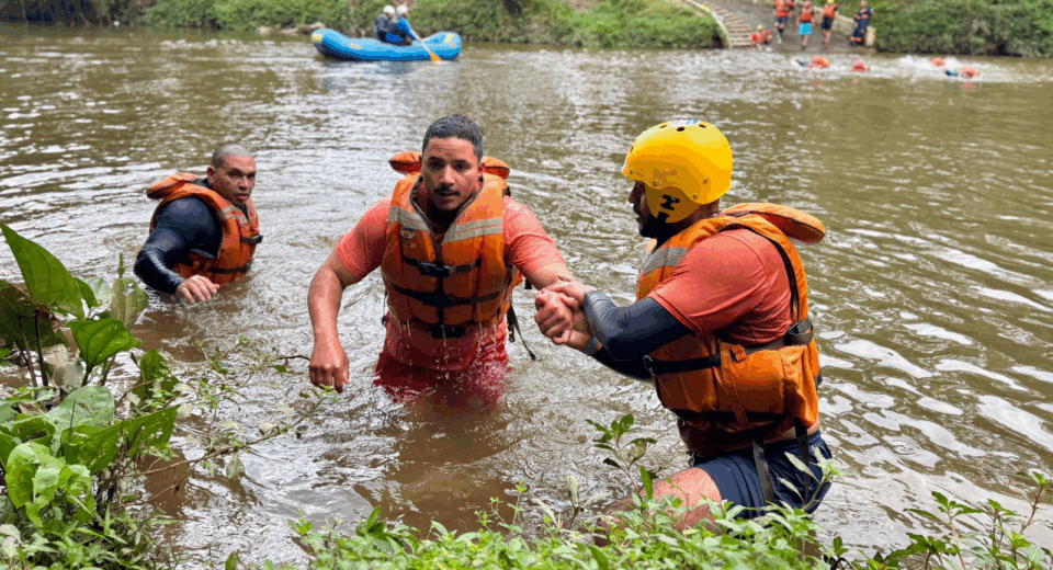 Exercício em Juquitiba, promovido pelo Condemat+, aprimora técnicas de resgate em ambientes alagados e corredeiras para agentes da região.