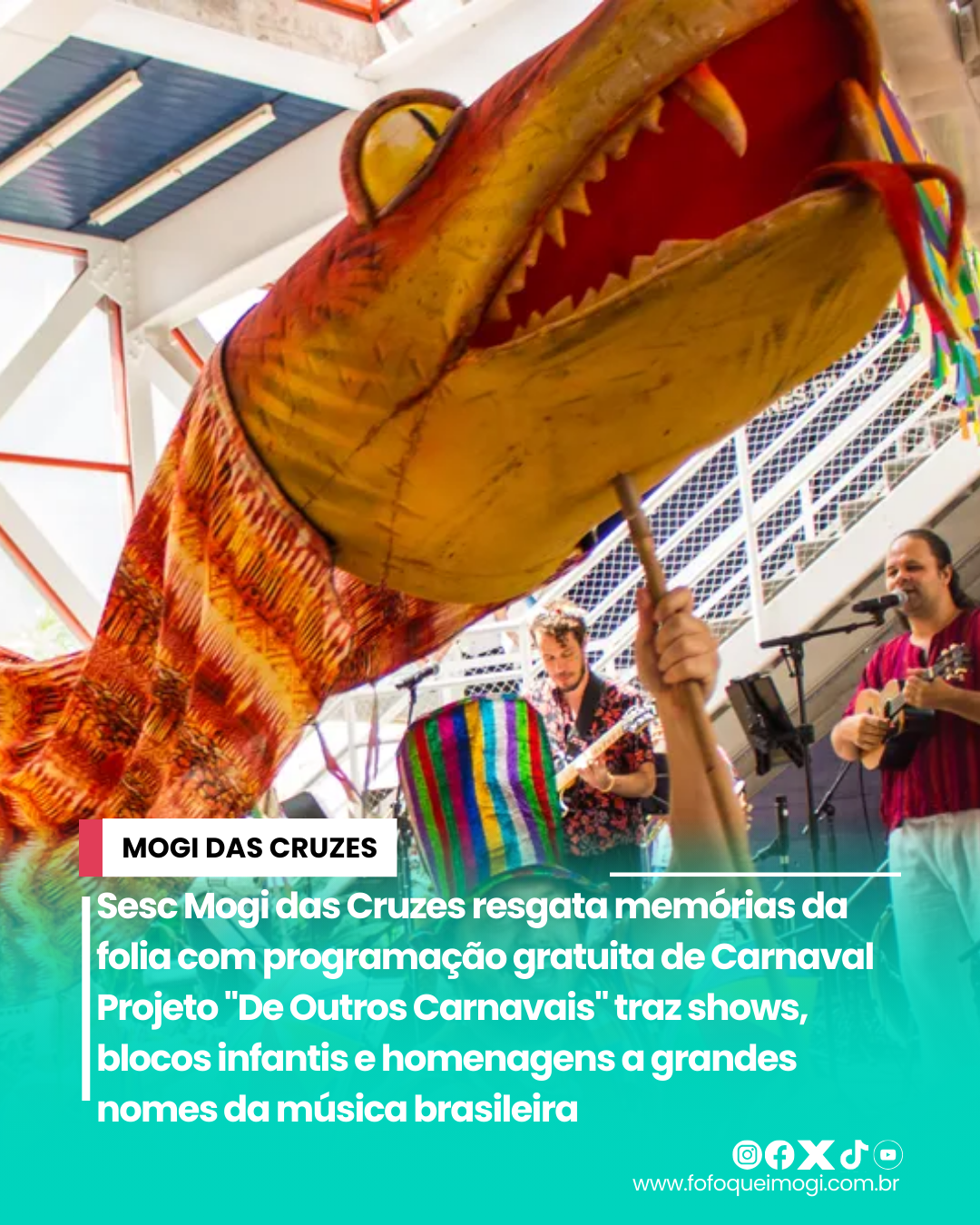 Mogi das Cruzes Sesc Mogi das Cruzes resgata memórias da folia com programação... Projeto “De Outros Carnavais” traz shows, blocos infantis e homenagens a grandes nomes da música brasileira O Sesc Mogi das... fevereiro 12, 2026