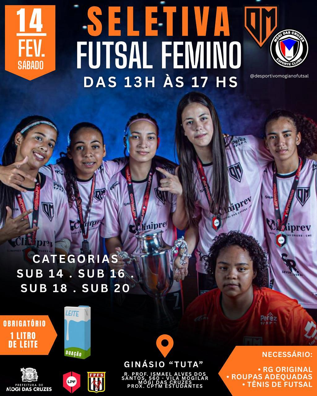 Mogi das Cruzes Mogi realiza seletiva de futsal feminino para diversas categorias neste... Chance para jovens talentos representarem a cidade em competições oficiais; entrada é 1 litro de leite Atenção, meninas apaixonadas por... fevereiro 12, 2026
